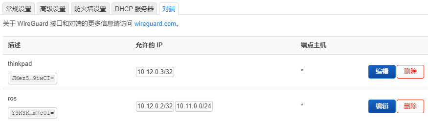 1 2 3 4 5 6 7 8 9 10 11 12 13 14[Interface] PrivateKey = 本机的私钥 Address = 10.12.0.3/24 [Peer] PublicKey = 位置一的公钥 AllowedIPs = 10.12.0.1/32, 10.11.0.0/24 Endpoint = ddns域名:位置一的端口 PersistentKeepalive = 30 [Peer] PublicKey = 位置二的公钥 AllowedIPs = 10.12.0.2/32, 10.11.0.0/24 PersistentKeepalive = 30 -
